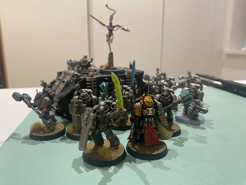 Emberlyn Driftwood, Illustrious Rogue Trader, sat atop the crate in the landing bay petting her Kroot pup. She looked down upon the 11 new Adeptus Astartes aboard her voidship. She’d recently, albeit reluctantly, been convinced by the Inquisitor to request a particular flavour of combat support. Ask and ye shall receive, apparently.