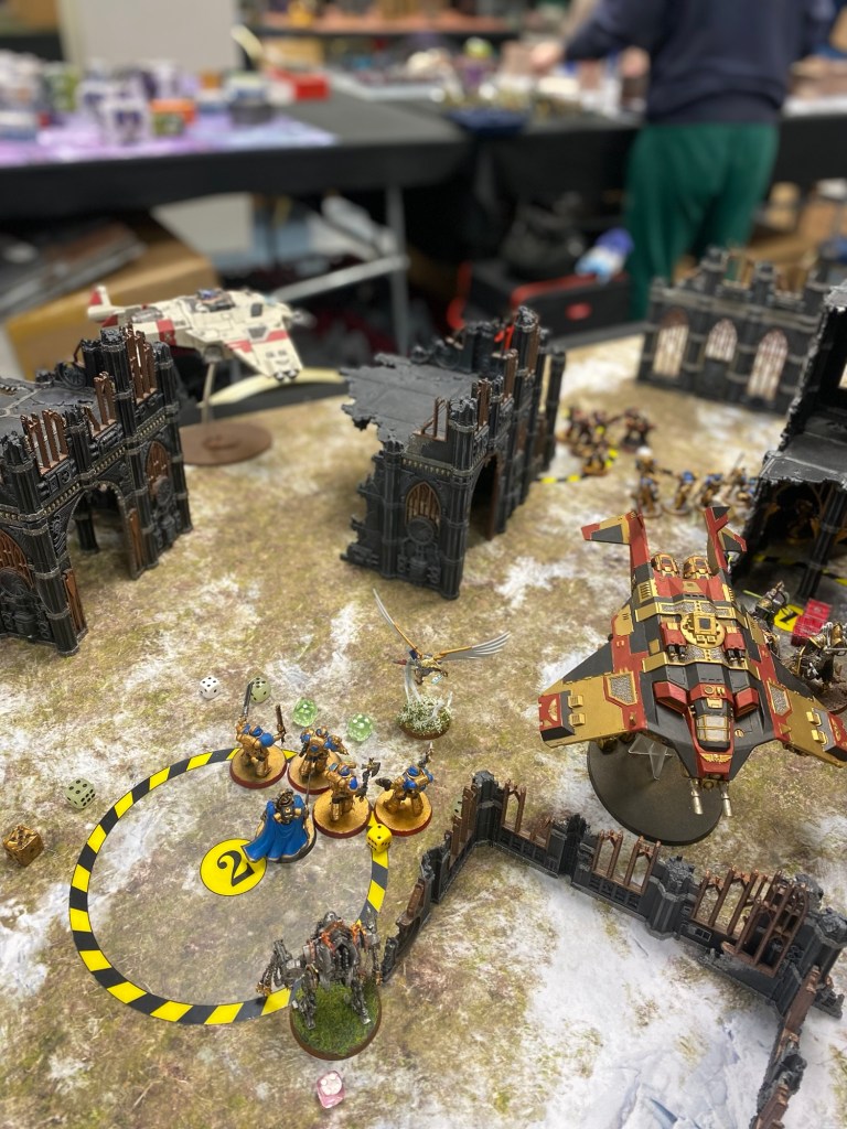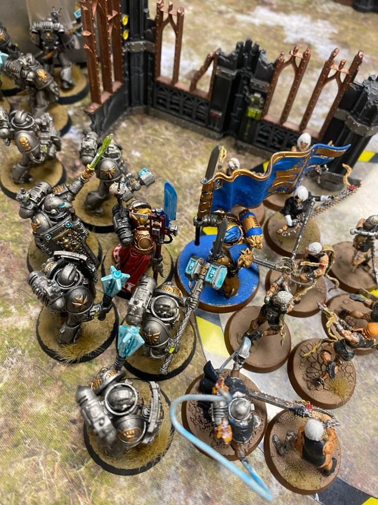 Working in tandem, mind-linked-to-machine, they avoided the incoming Hunter Killer Missile. Those things never hit anyway. The Corvus Blackstar stabilised its flight-path and exited the Cathedrel’s combat zone. Nearby, a winged hero of the Adepta Sororitas was shot down and got crushed by a building. This was the sixth death of the Living Saint. No tears were shed from the Watch Master as he knew she’d be back.